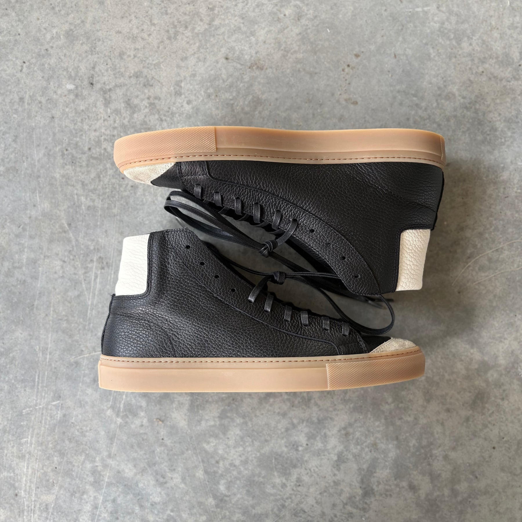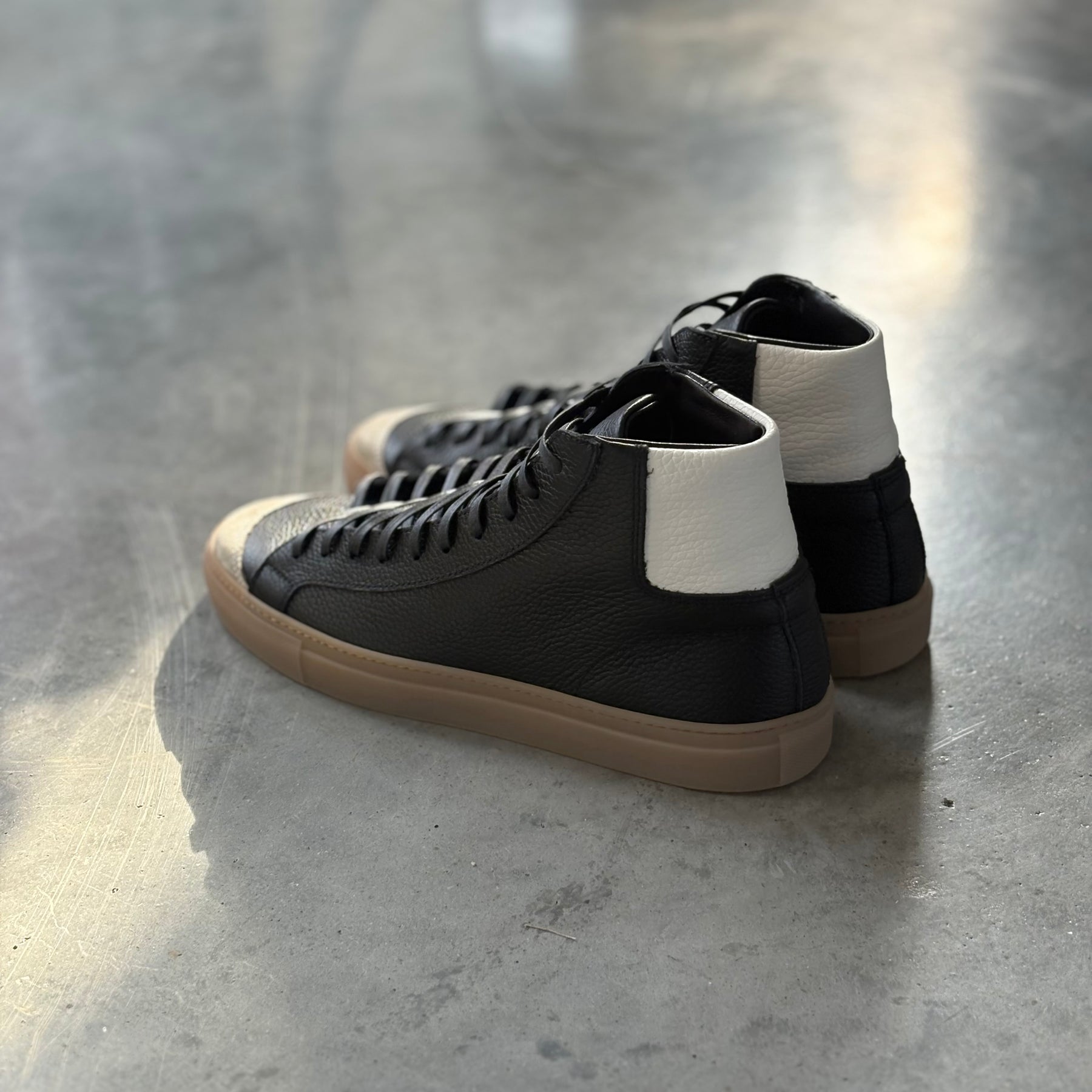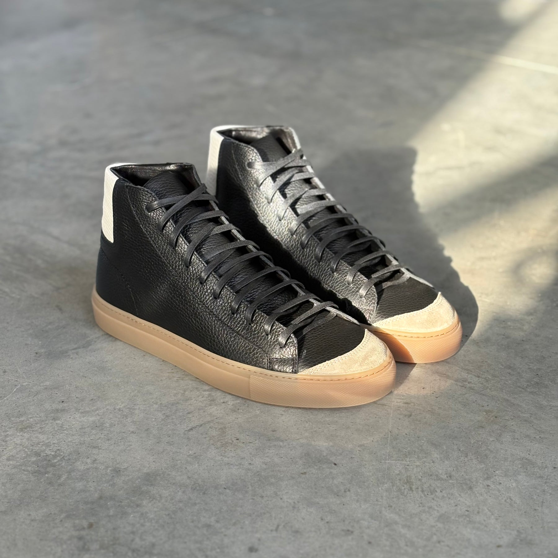 The James Court Sneaker was designed in house to reference the classic court sneakers of the 70s. Tumbled black calfskin with tumbled ivory collar accent and Milkshake suede toe cap. One of our best selling low tops, now in a high top silhouette. Probably going to be the best high top sneaker you've ever owned!