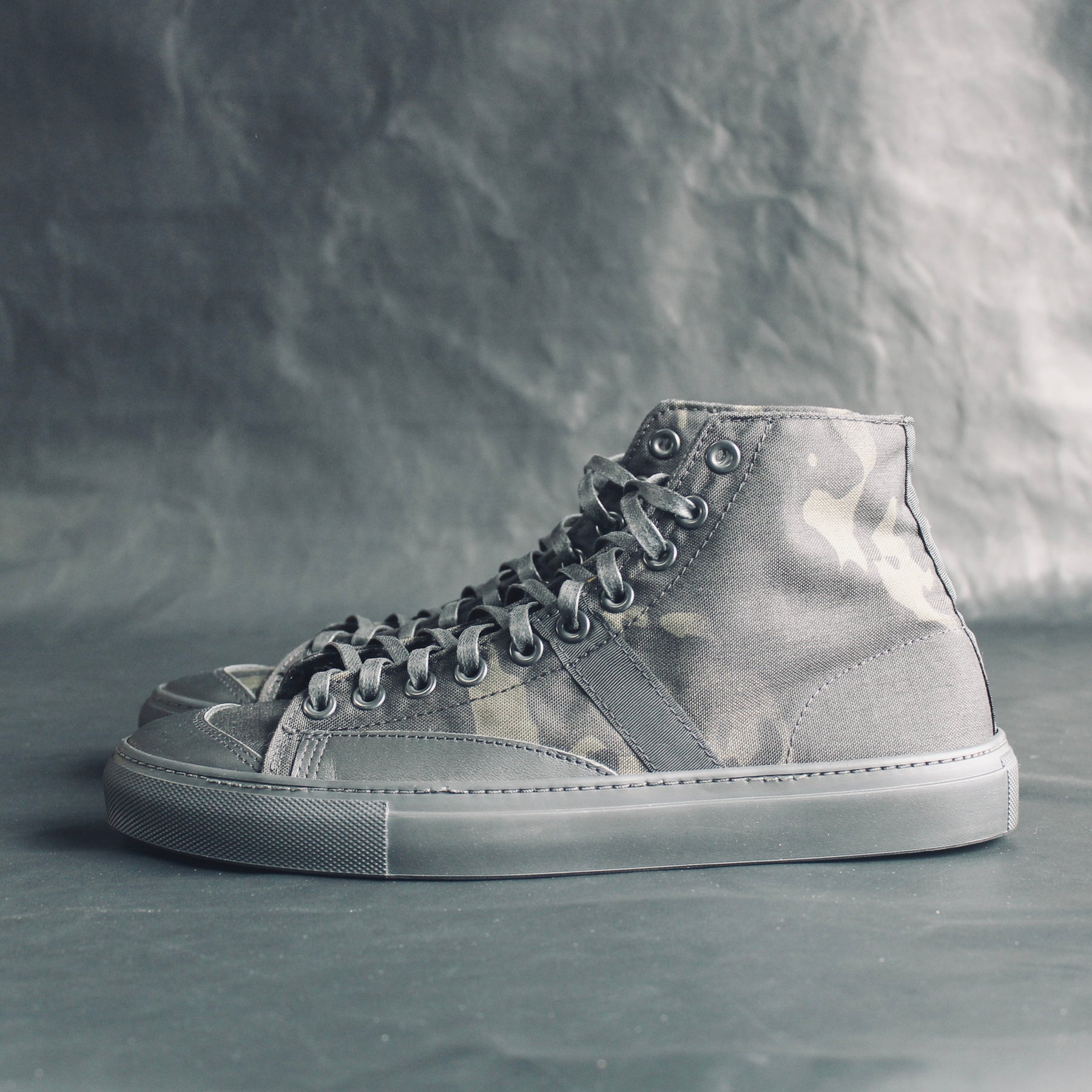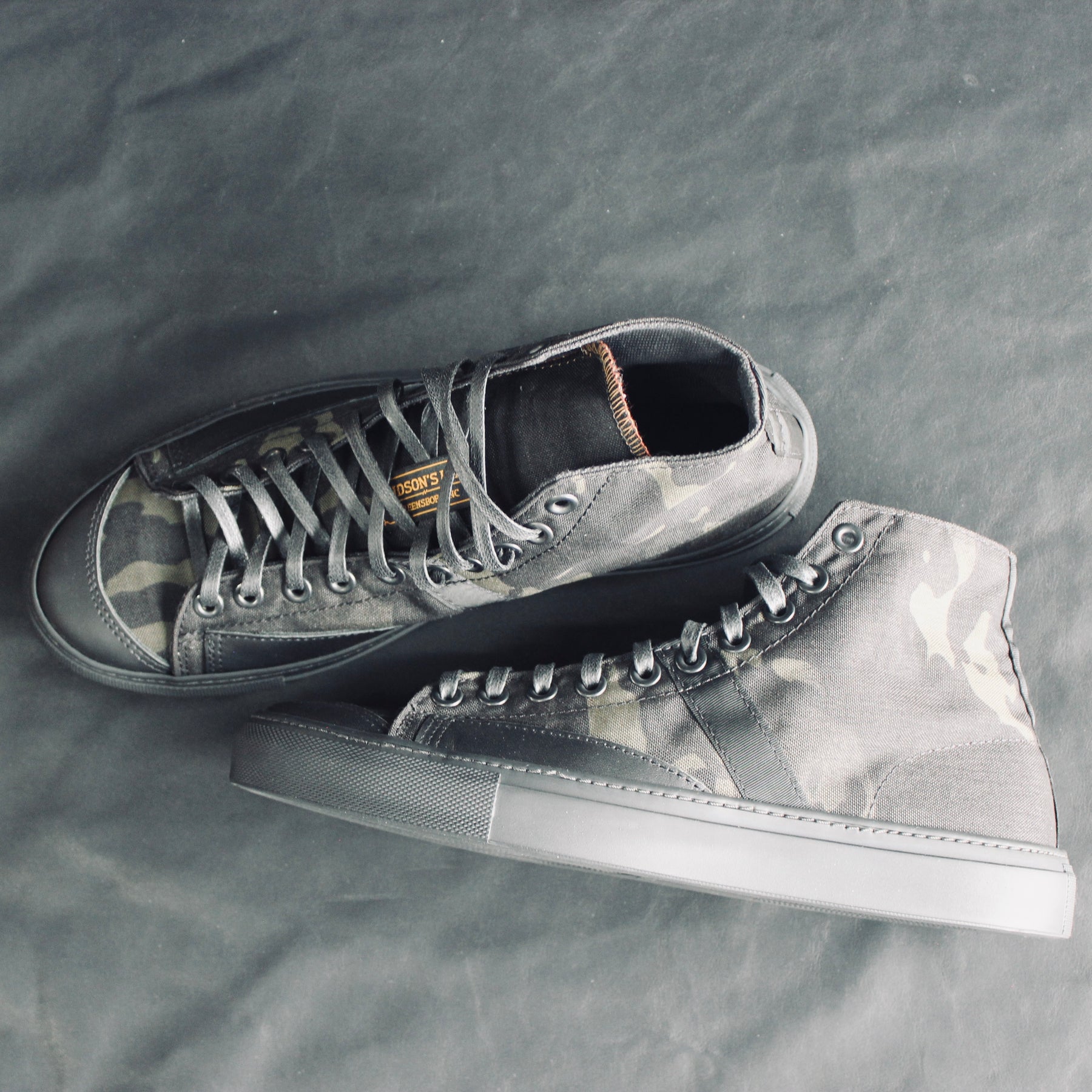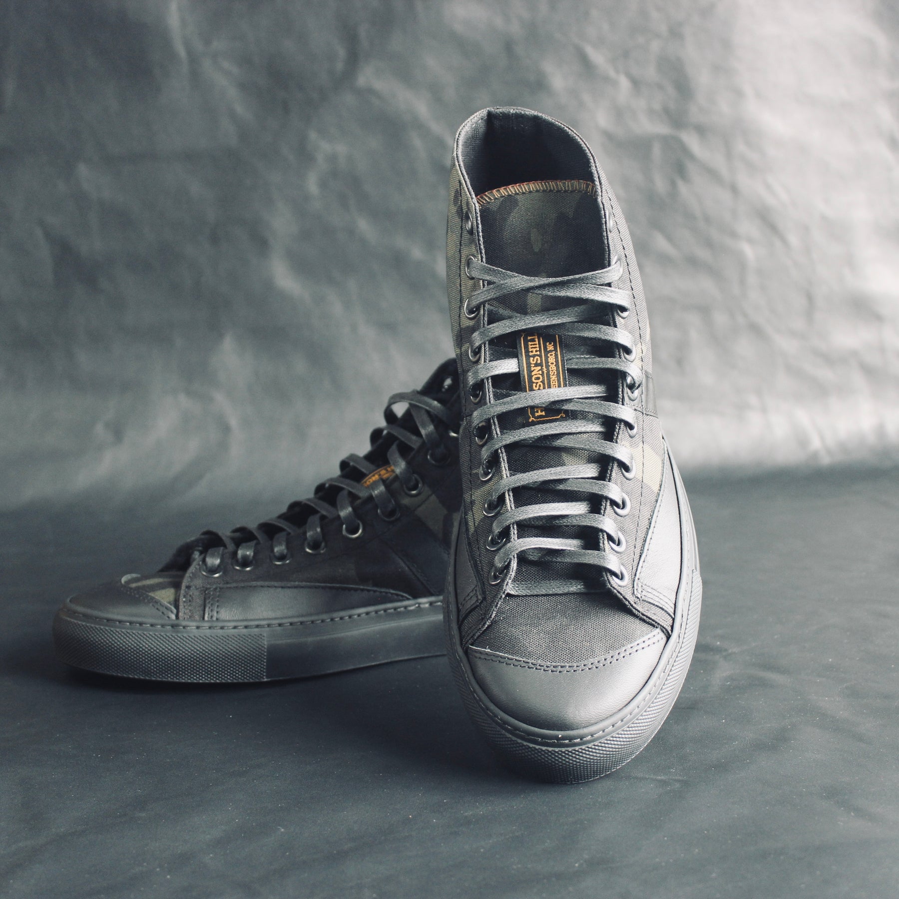 Uppers are crafted from 500Denier Cordura Nylon in Multicam Black, with Horween leather accents and black nylon webbing. C.S. Osborne black eyelets and cotton glazed laces by American Legacy in Hickory, NC. Finished on a black Margom sole (these babies are eligible for our re-sole program). Made, start to finish, in our small American sneaker factory.